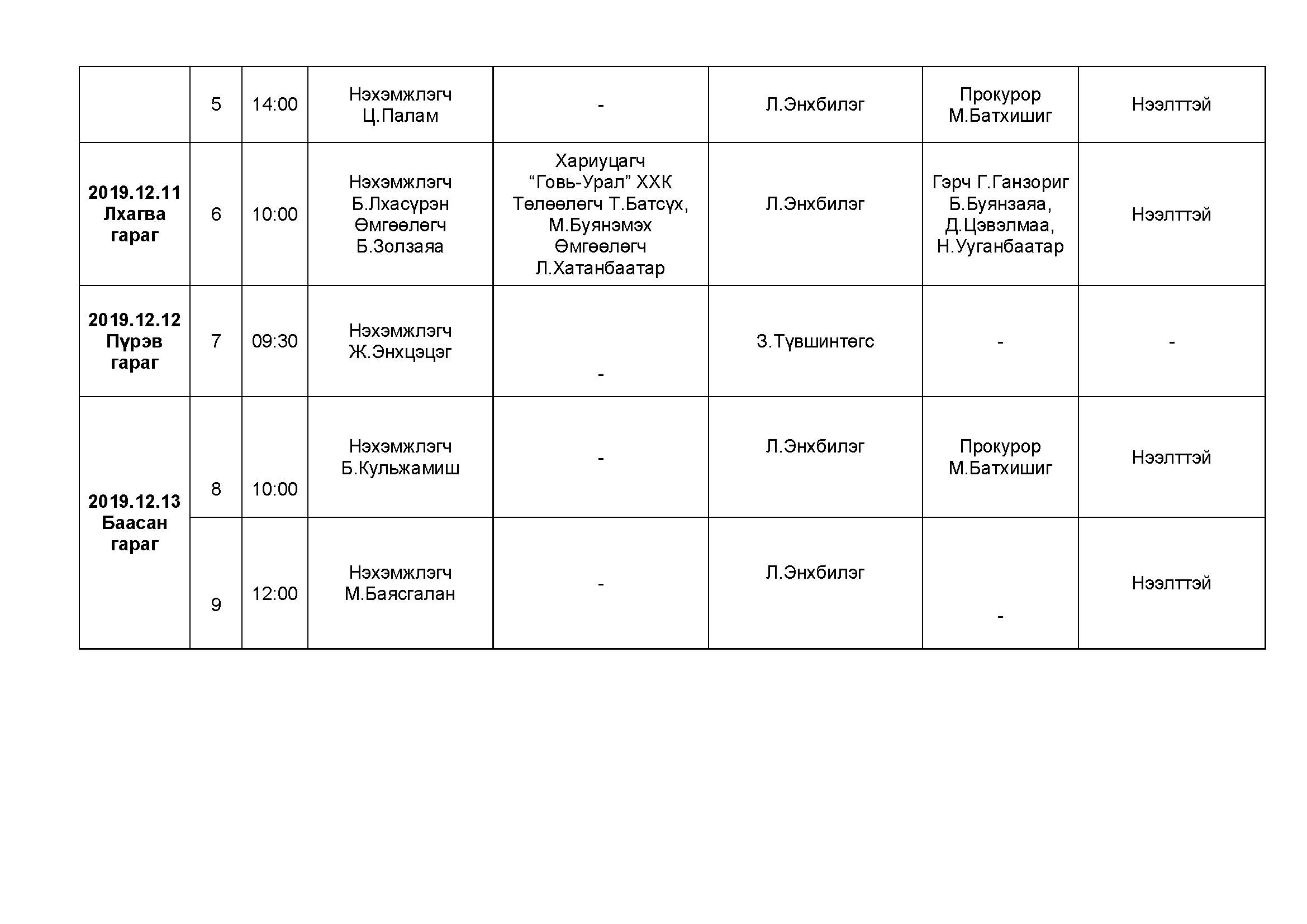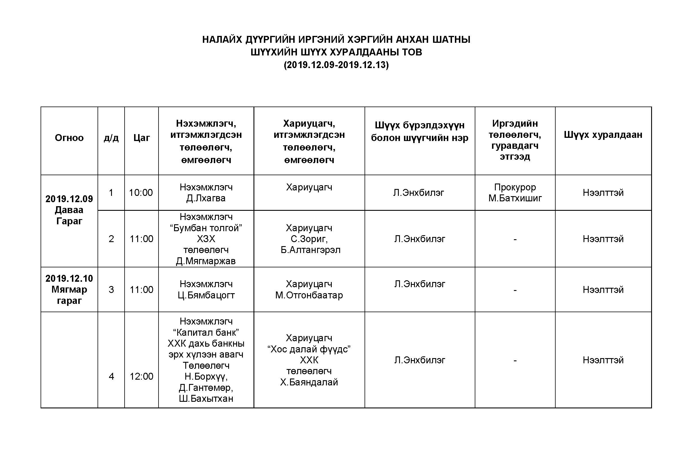 Налайх - Шүүх хуралдаанаар хэлэлцэх иргэний хэргүүд (2019.12.09-12.13)