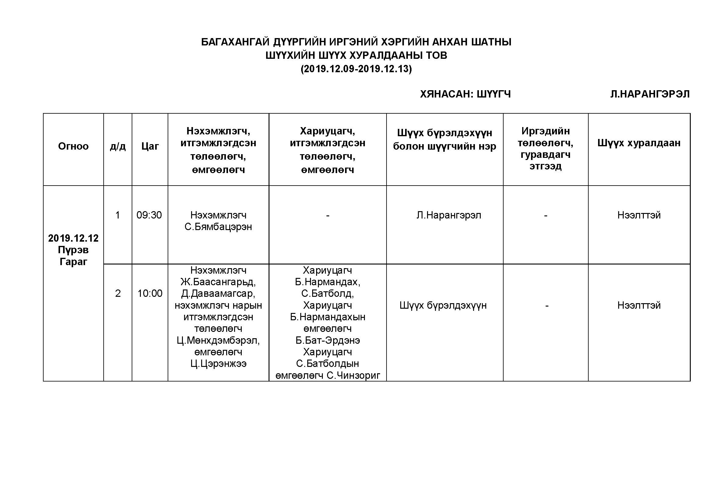 Багахангай - Шүүх хуралдаанаар хэлэлцэх иргэний хэргүүд (2019.12.09-12.13)