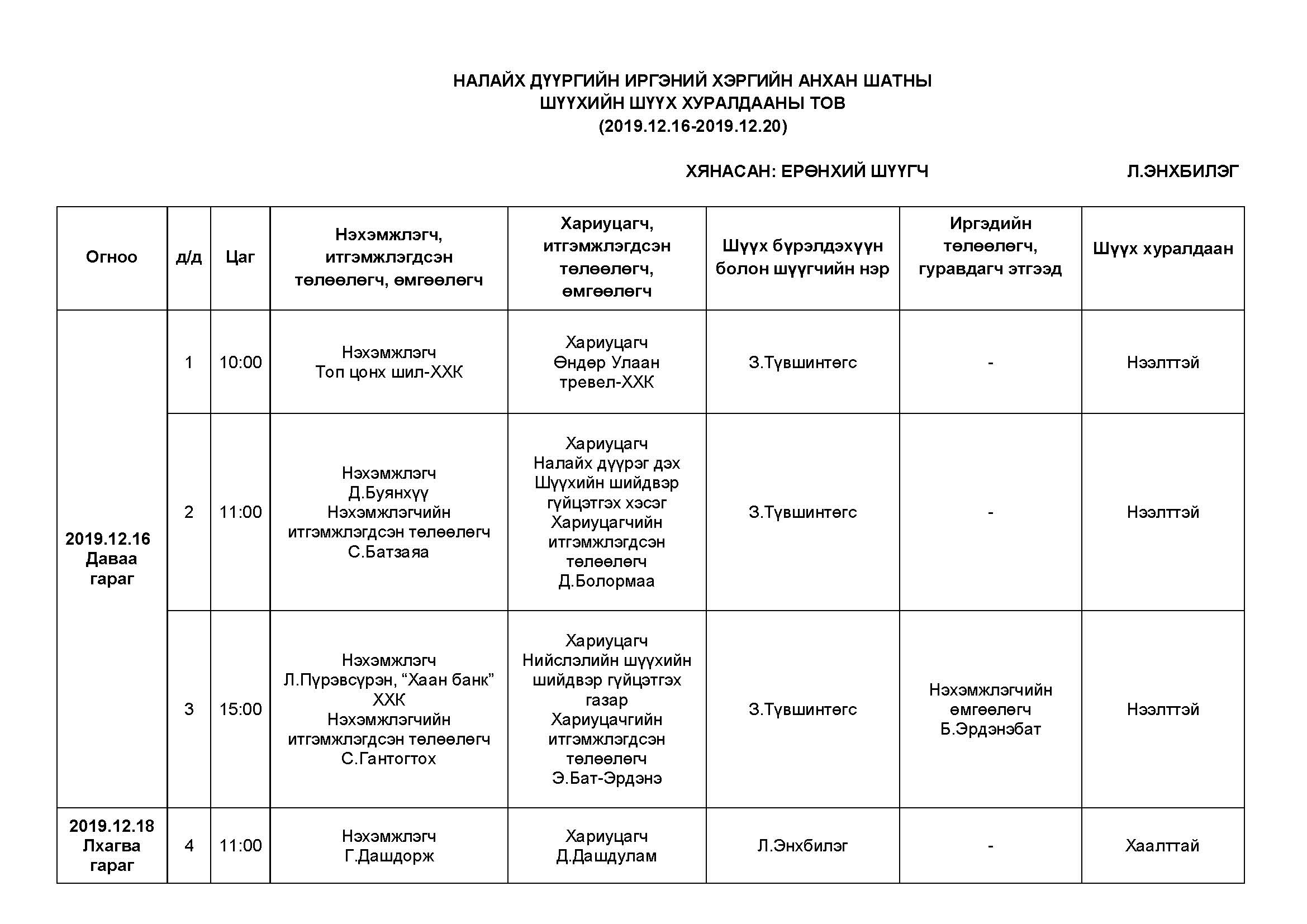 Налайх - Шүүх хуралдаанаар хэлэлцэх иргэний хэргүүд (2019.12.16-12.20)