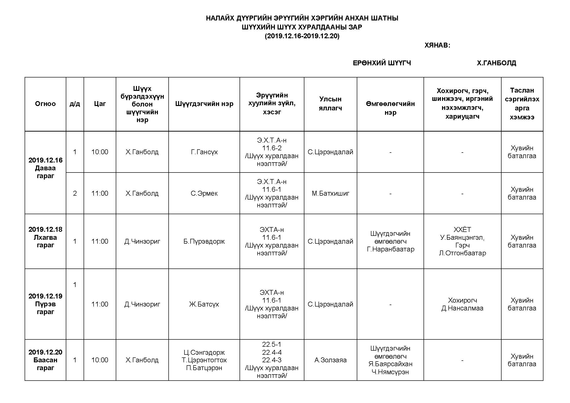 НАЛАЙХ - АНХАН ШАТНЫ ШҮҮХ ХУРАЛДААНААР ХЭЛЭЛЦҮҮЛЭХ ЭРҮҮГИЙН ХЭРГҮҮД (2019.12.16-12.20)