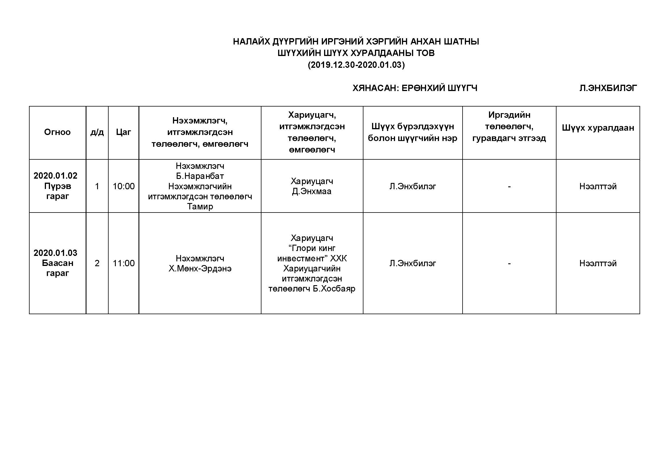 Налайх - Шүүх хуралдаанаар хэлэлцэх иргэний хэргүүд (2019.12.30-2020.01.03)
