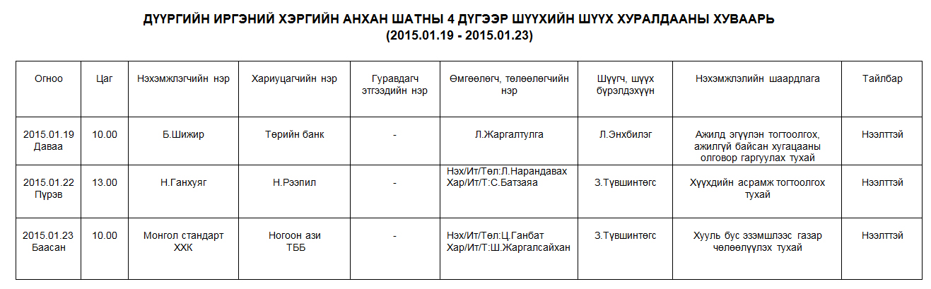 Шүүх хуралдаанаар хэлэлцэх иргэний хэргүүд (2015.01.19 - 2015.01.23)