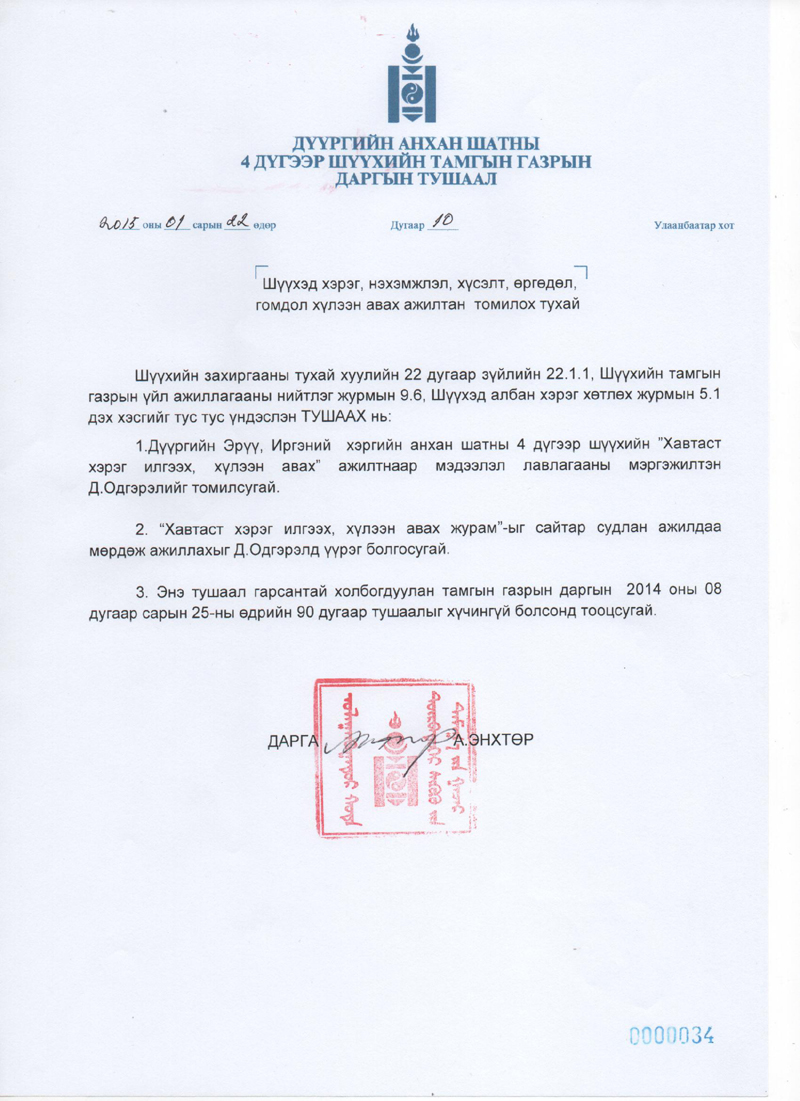 Шүүхэд хэрэг, иэхэмжлэл, хүсэлт, өргөдөл, гомдол хүлээн авах ажилтан томилох тухай