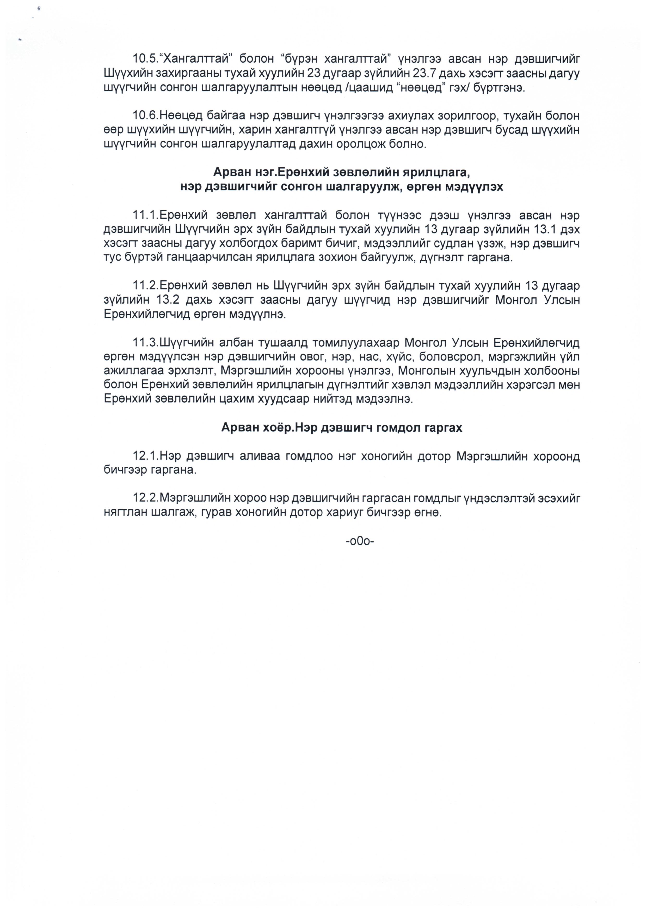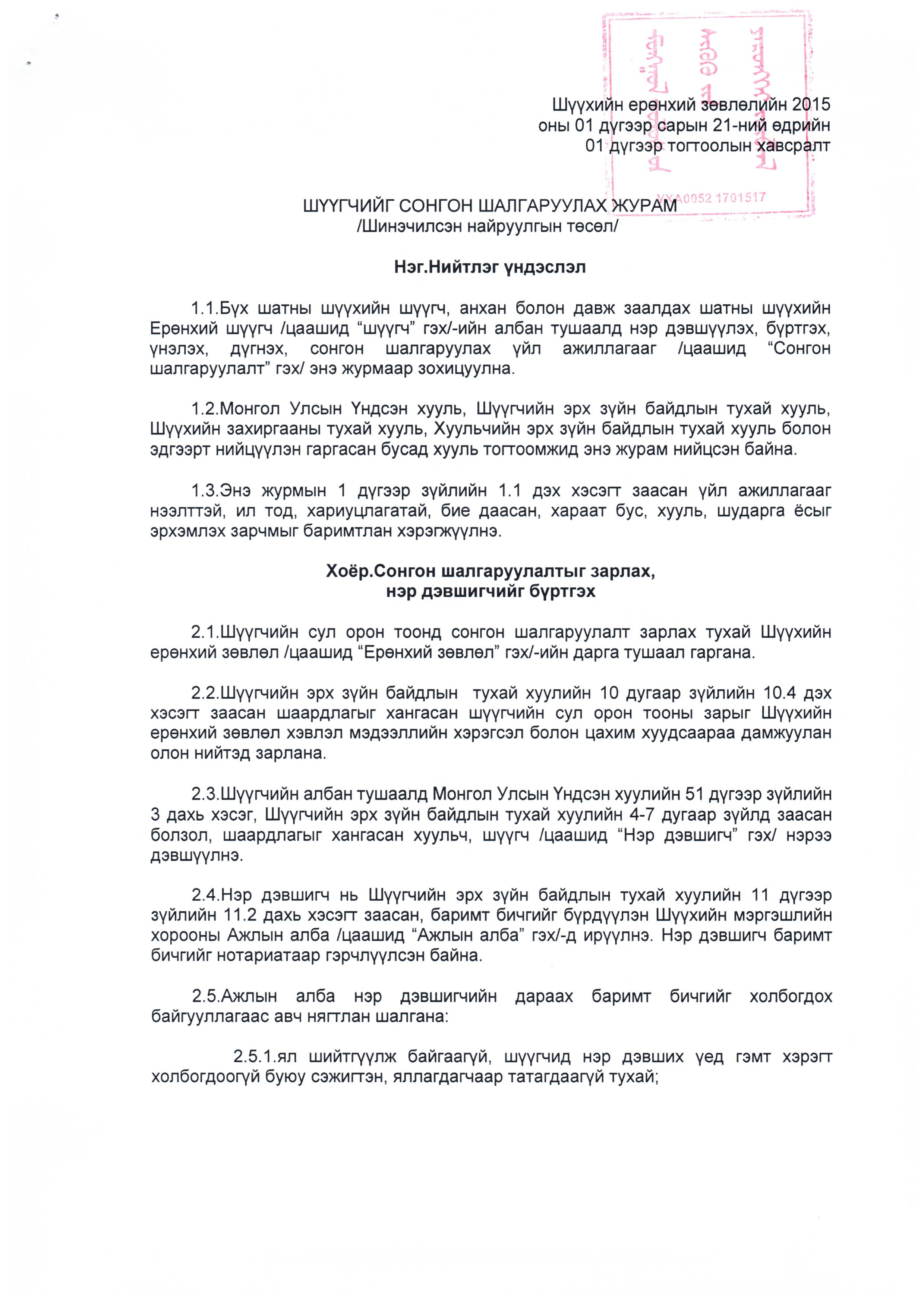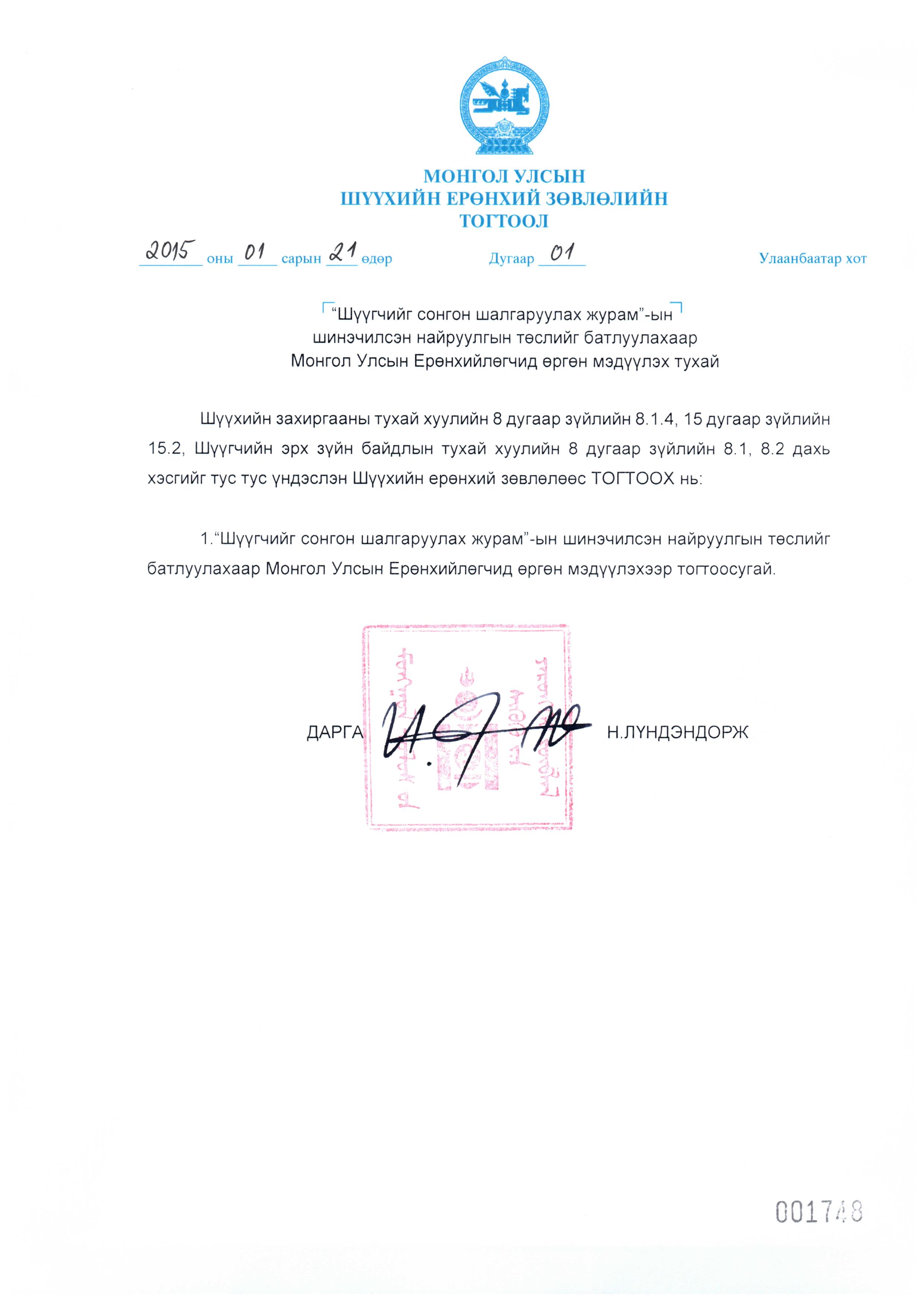 "Шүүгчийг сонгон шалгаруулах журам"-ын шинэчилсэн найруулгын төслийг Монгол Улсын Ерөнхийлөгчид өргөн мэдүүллээ