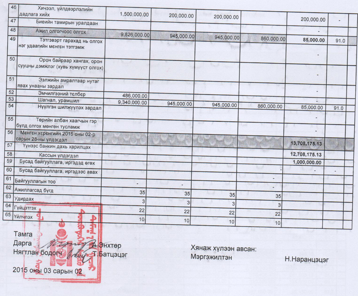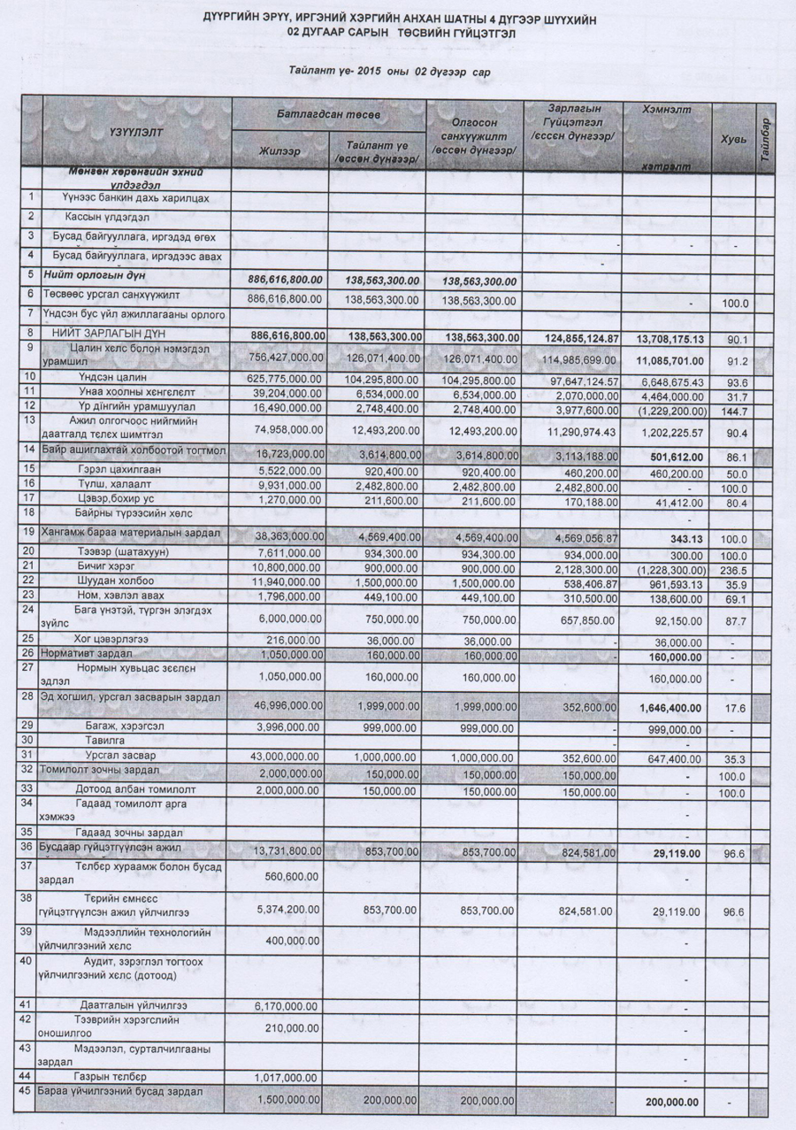 Дүүргийн эрүү, иргэний хэргийн анхан шатны 4 дүгээр шүүхийн 2015 оны 2 дугаар сарын төсвийн гүйцэтгэл