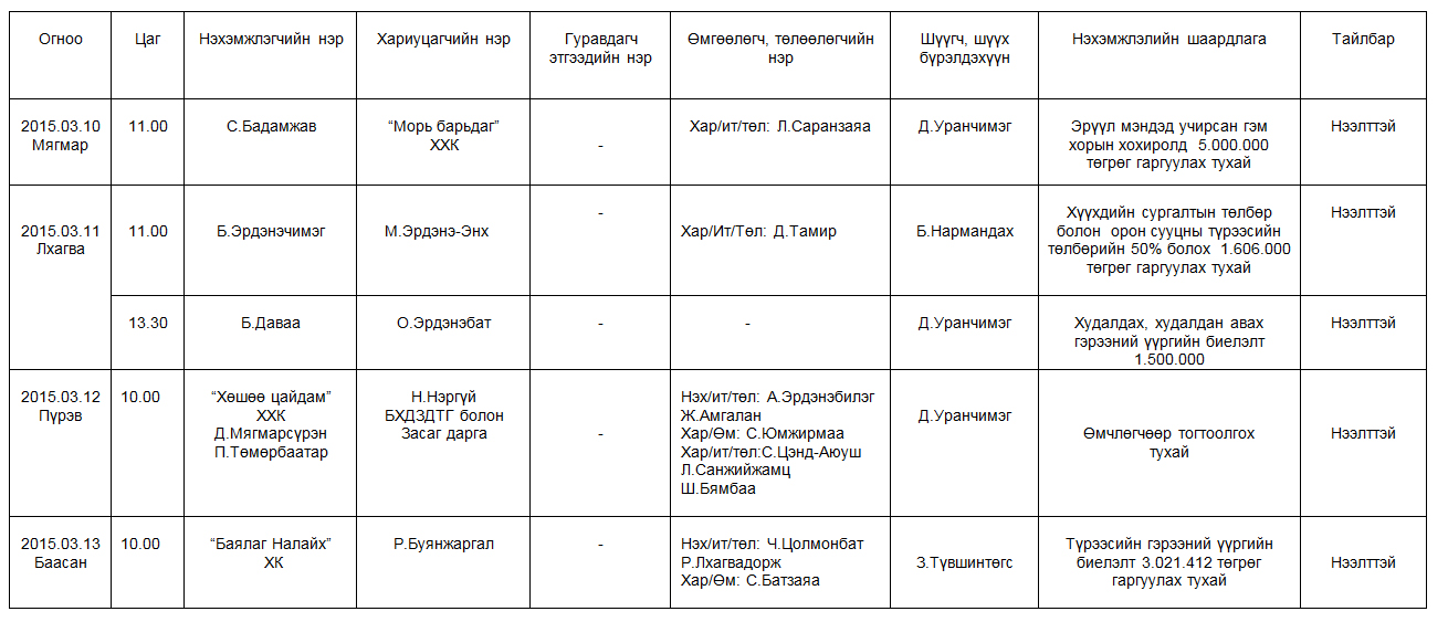 Шүүх хуралдаанаар хэлэлцэх иргэний хэргүүд (2015.03.09-03.13)