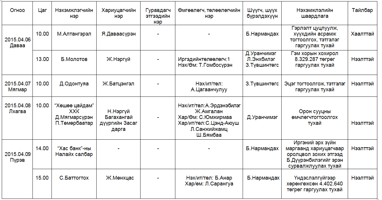 Шүүх хуралдаанаар хэлэлцэх иргэний хэргүүд (2015.04.06-04.10)