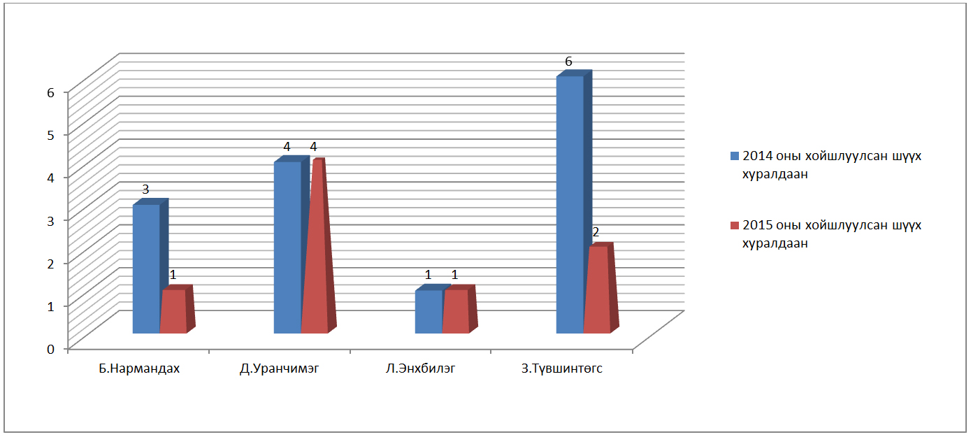 Дээрх графикаас харвал: Ерөнхий шүүгч Б.Нармандахын хойшлуулсан шүүх хуралдааны тоо өмнөх оныхоос  2-оор буурсан, шүүгч З.Түвшинтөгсийн хойшлуулсан шүүх хуралдааны тоо өмнөх оныхоос 4-өөр буурсан, шүүгч Д.Уранчимэг, Л.Энхбилэг нарынх өмнөх оныхтой адил үзүүлэлттэй байв.