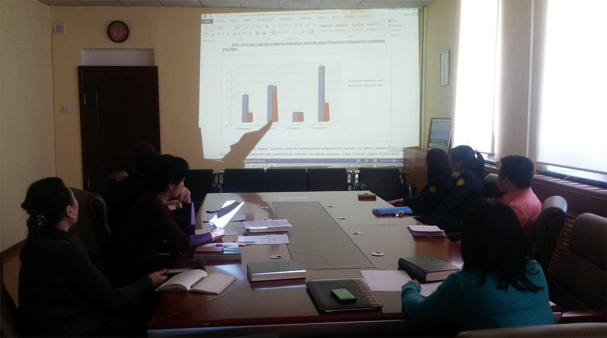 Дүүргийн Иргэний хэргийн анхан шатны 4 дүгээр шүүх 2014, 2015 оны 1 дүгээр улиралд хойшлуулсан шүүх хуралдааны харьцуулсан судалгааг гаргаж, цаашид анхаарах асуудлын талаар ярилцлаа