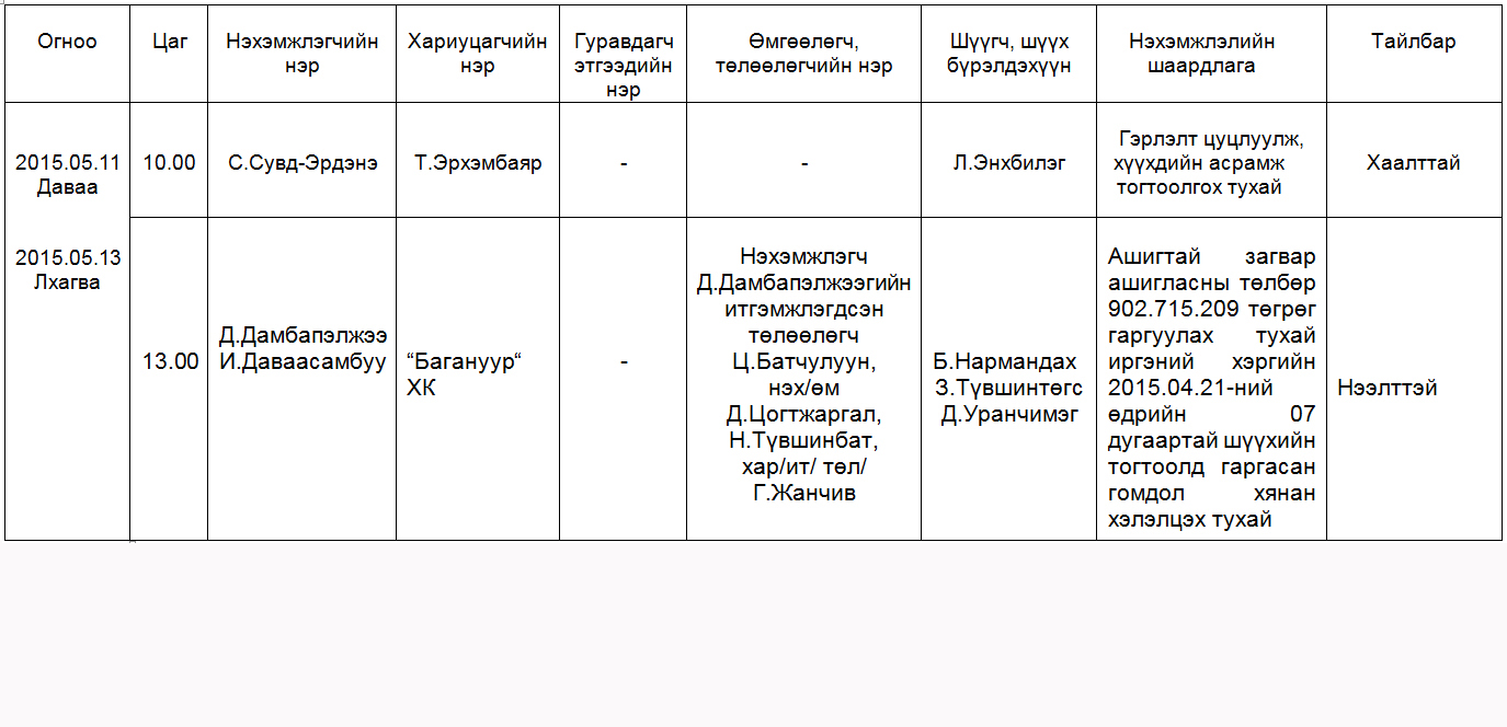Шүүх хуралдаанаар хэлэлцэх иргэний хэргүүд (2015.05.11-05.15)
