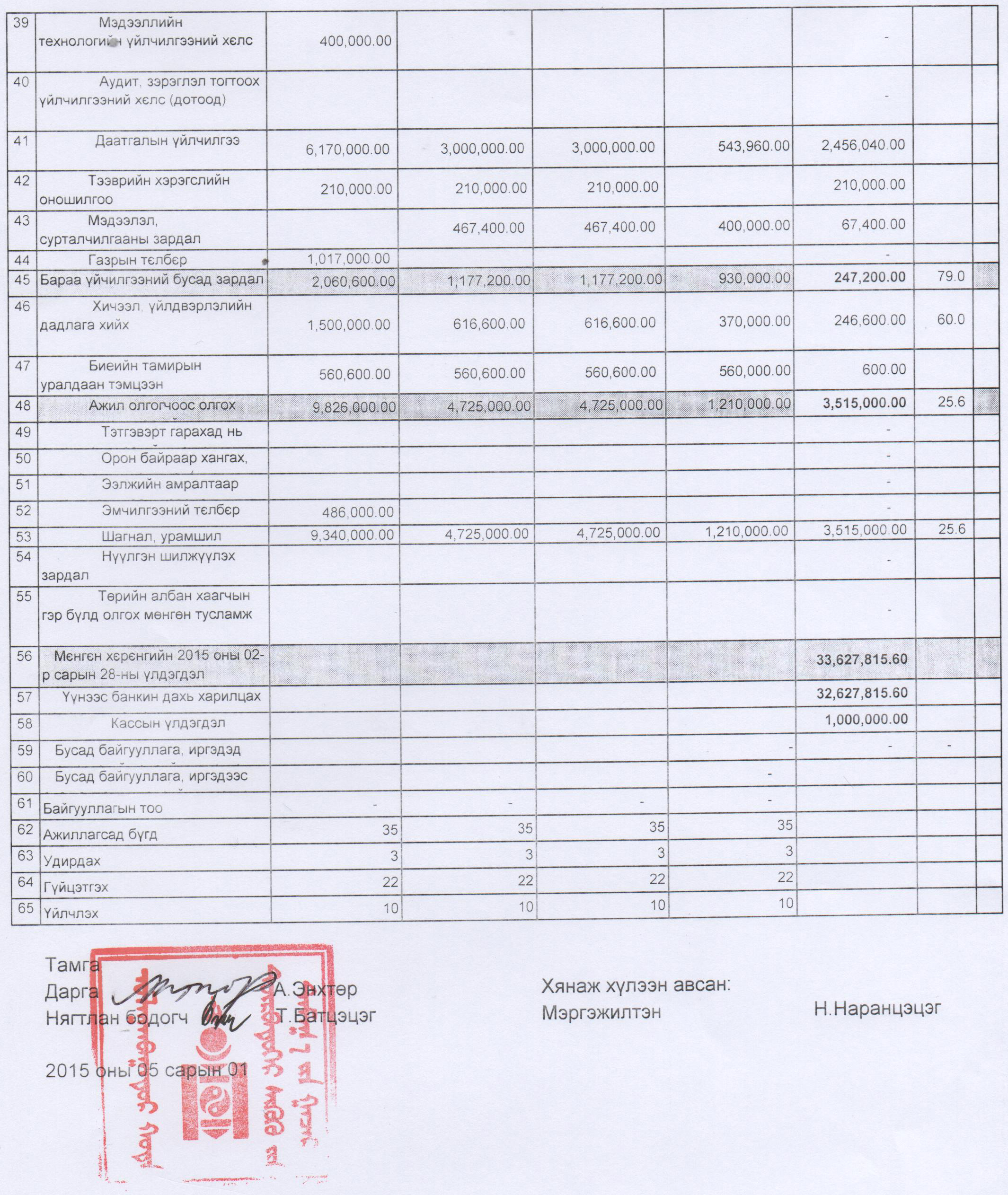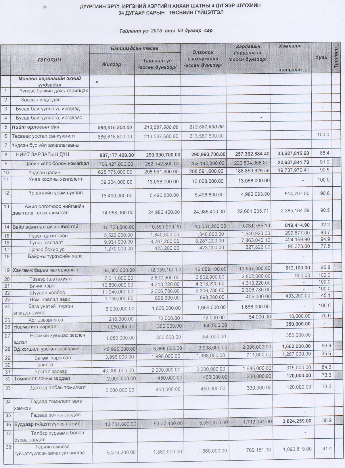 Дүүргийн эрүү, иргэний хэргийн анхан шатны 4 дүгээр шүүхийн 2015 оны 4 дүгээр сарын төсвийн гүйцэтгэлийн тайлан