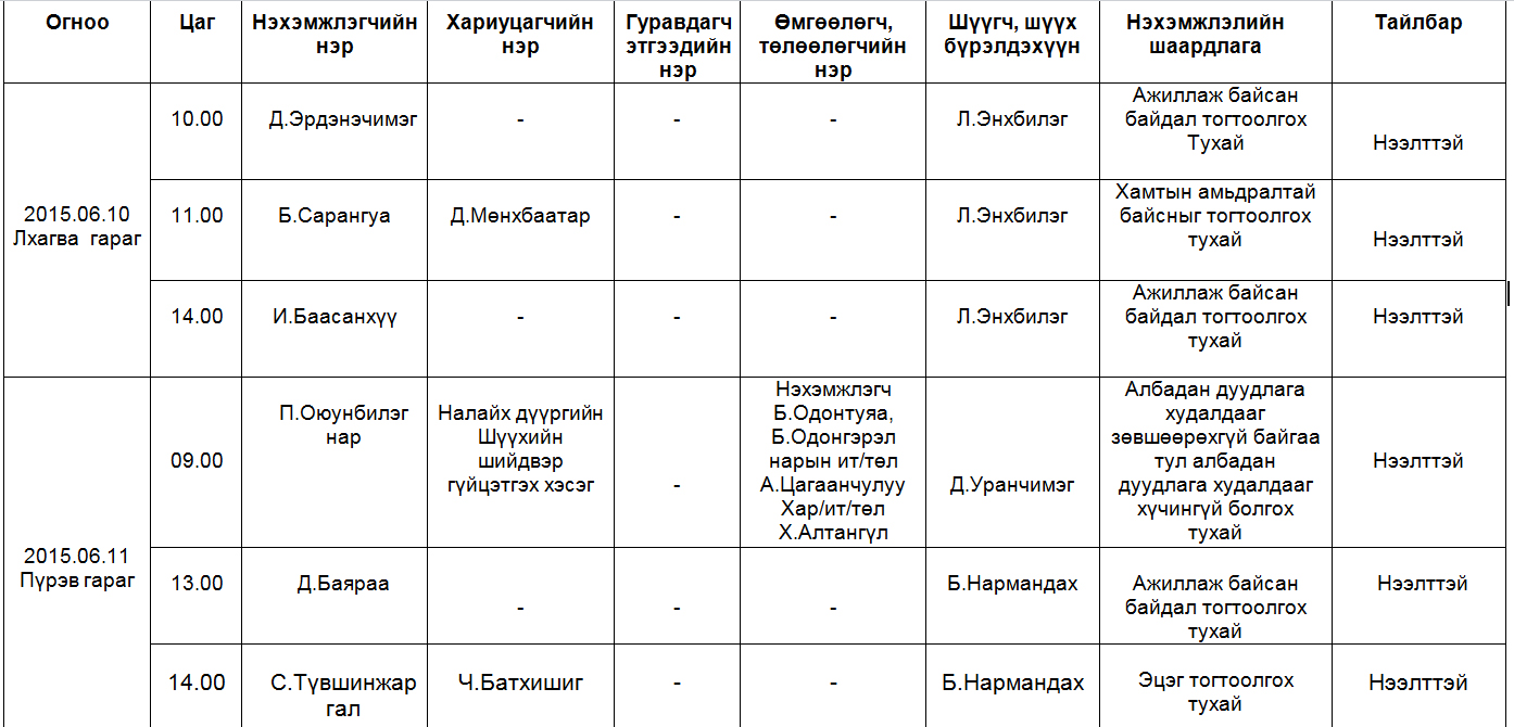 Шүүх хуралдаанаар хэлэлцэх иргэний хэргүүд (2015.06.08-06.12)