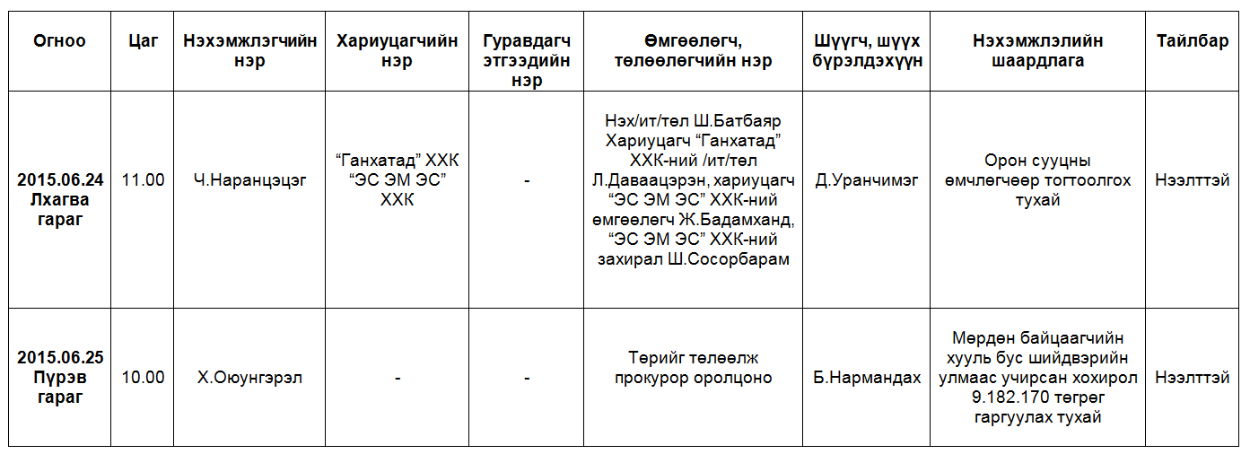 Шүүх хуралдаанаар хэлэлцэх иргэний хэргүүд (2015.06.22-06.26)