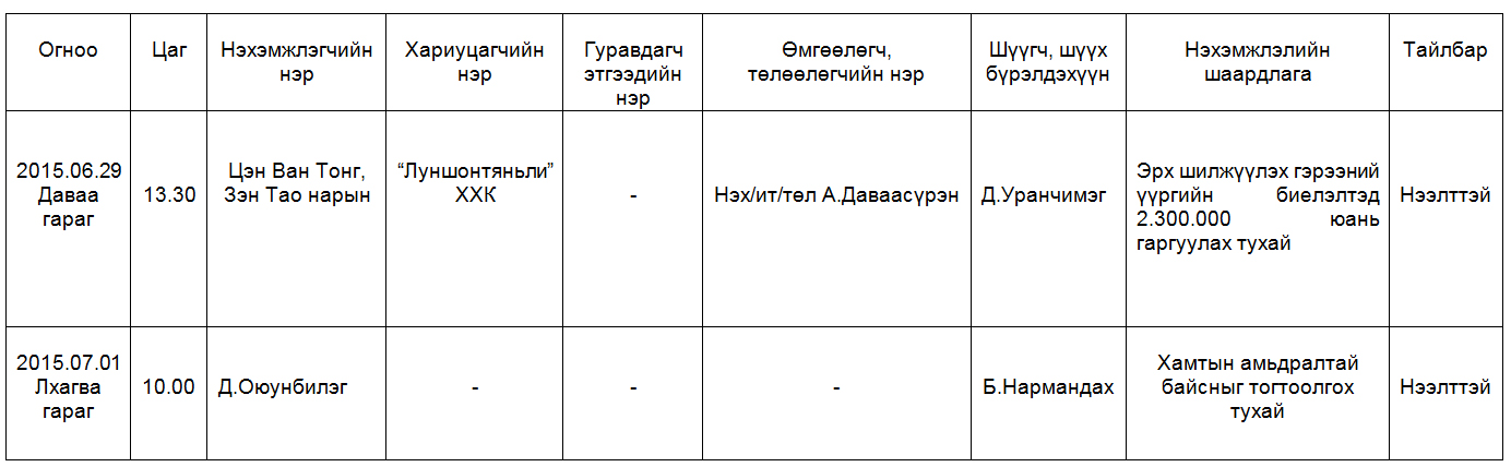 Шүүх хуралдаанаар хэлэлцэх иргэний хэргүүд (2015.06.29-07.03)