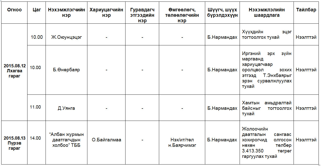Шүүх хуралдаанаар хэлэлцэх иргэний хэргүүд (2015.08.10-14)