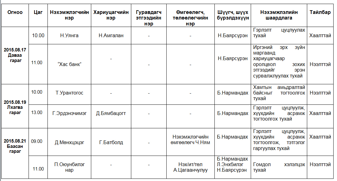 Шүүх хуралдаанаар хэлэлцэх иргэний хэргүүд (2015.08.17-21)