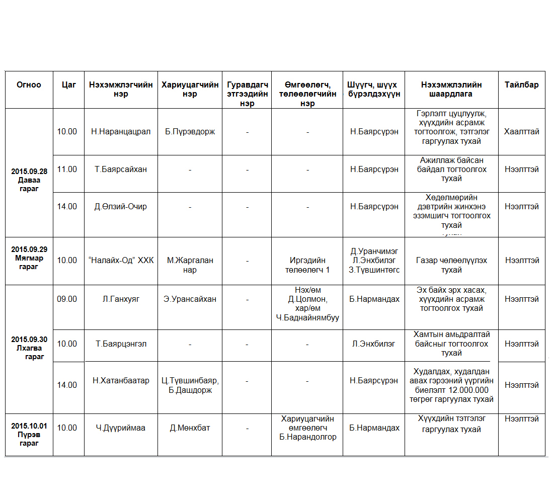 Шүүх хуралдаанаар хэлэлцэх иргэний хэргүүд (2015.09.28-10.02)