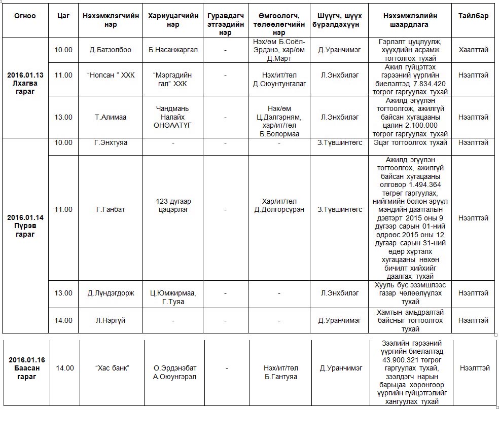 Шүүх хуралдаанаар хэлэлцэх иргэний хэргүүд (2016.01.11-01.15)