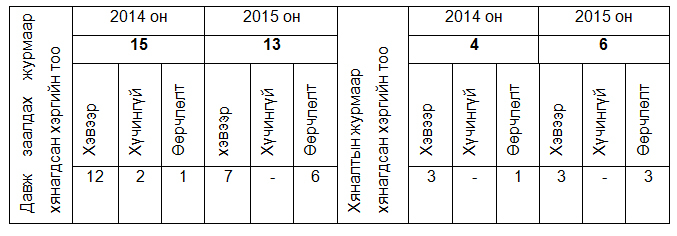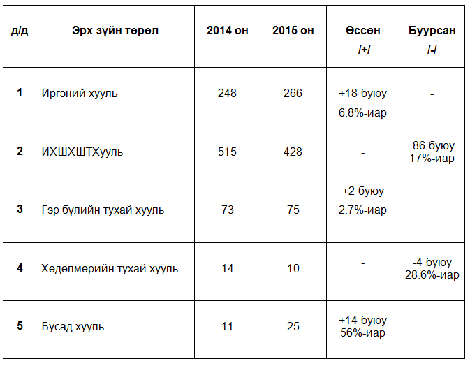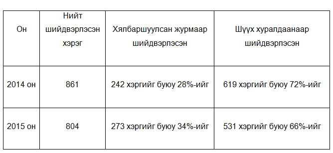 Харин 2015 онд хянан шийдвэрлэсэн нийт 804 хэргийн 273 хэргийг буюу 34%-ийг ИХШХШТХ-ийн 74, 75, 106 дугаар зүйлүүдэд зааснаар хялбаршуулсан журмаар, 531 хэргийг буюу 66%-ийг ИХШХШТХ-ийн 115, 117 дугаар зүйлүүдэд зааснаар шүүх хуралдаанаар хянан шийдвэрлэсэн байна.