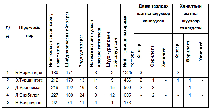 2015 онд хүлээн авч, шийдвэрлэсэн хэрэг болон шүүн таслах ажиллагааны чанарыг шүүгч тус бүрээр хүснэгтээр харуулбал: