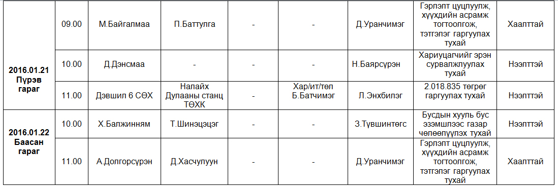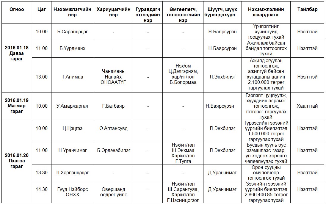 Шүүх хуралдаанаар хэлэлцэх иргэний хэргүүд (2016.01.18-01.22)