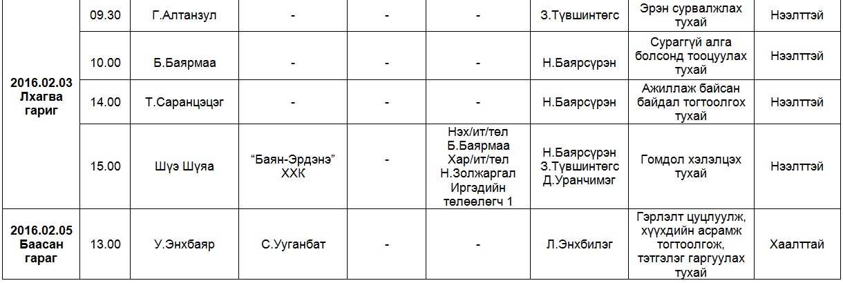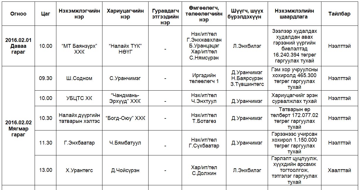 Шүүх хуралдаанаар хэлэлцэх иргэний хэргүүд (2016.02.01-02.05)
