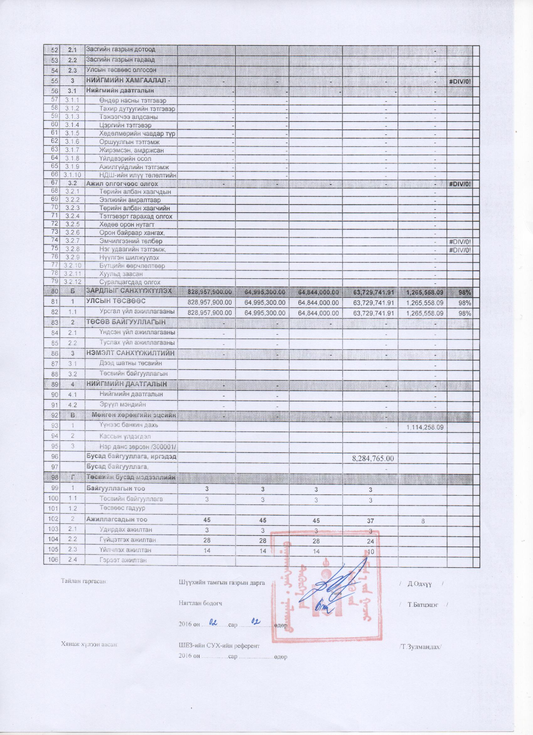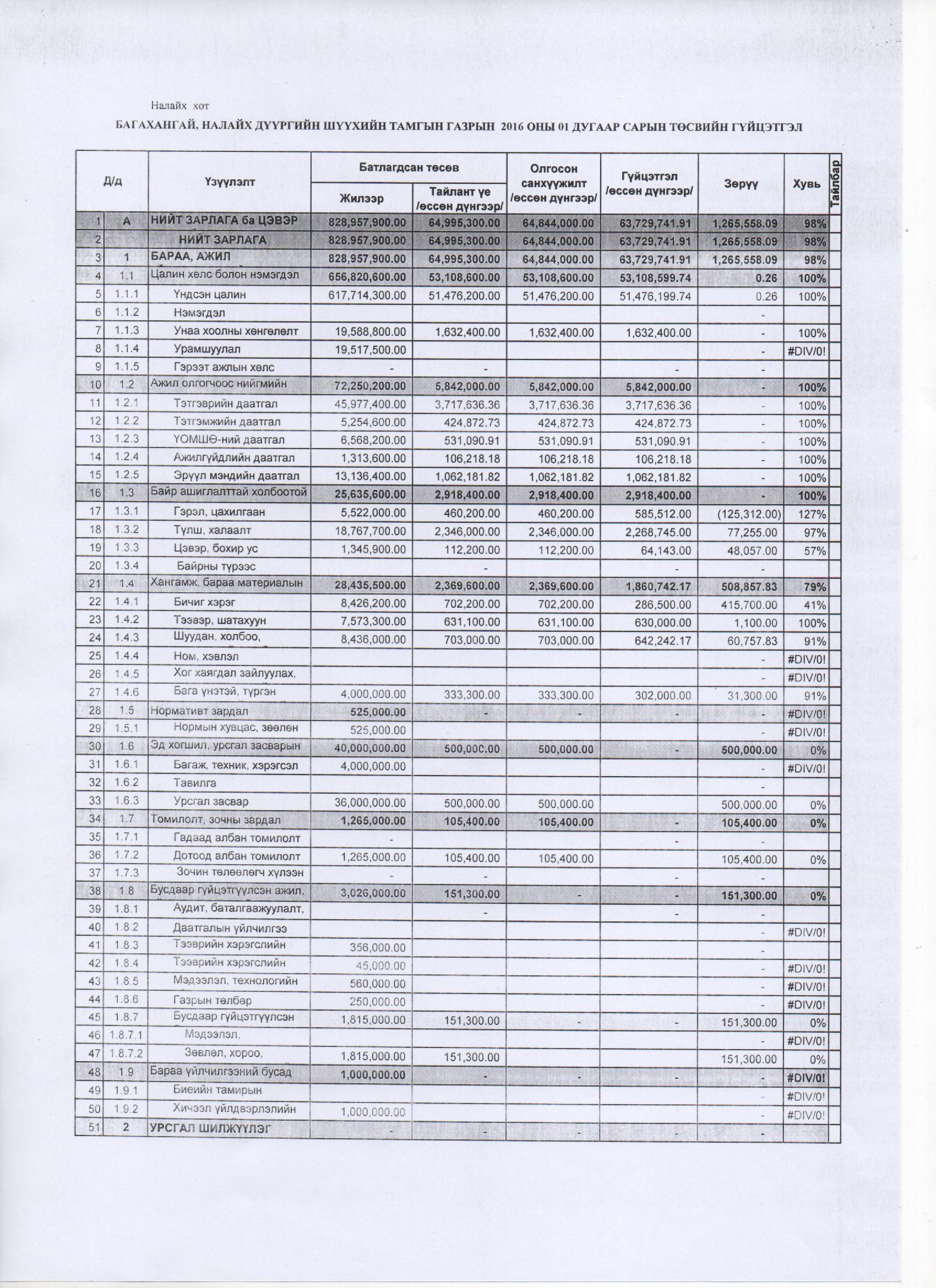 2016 оны 1 дүгээр сарын төсвийн гүйцэтгэл