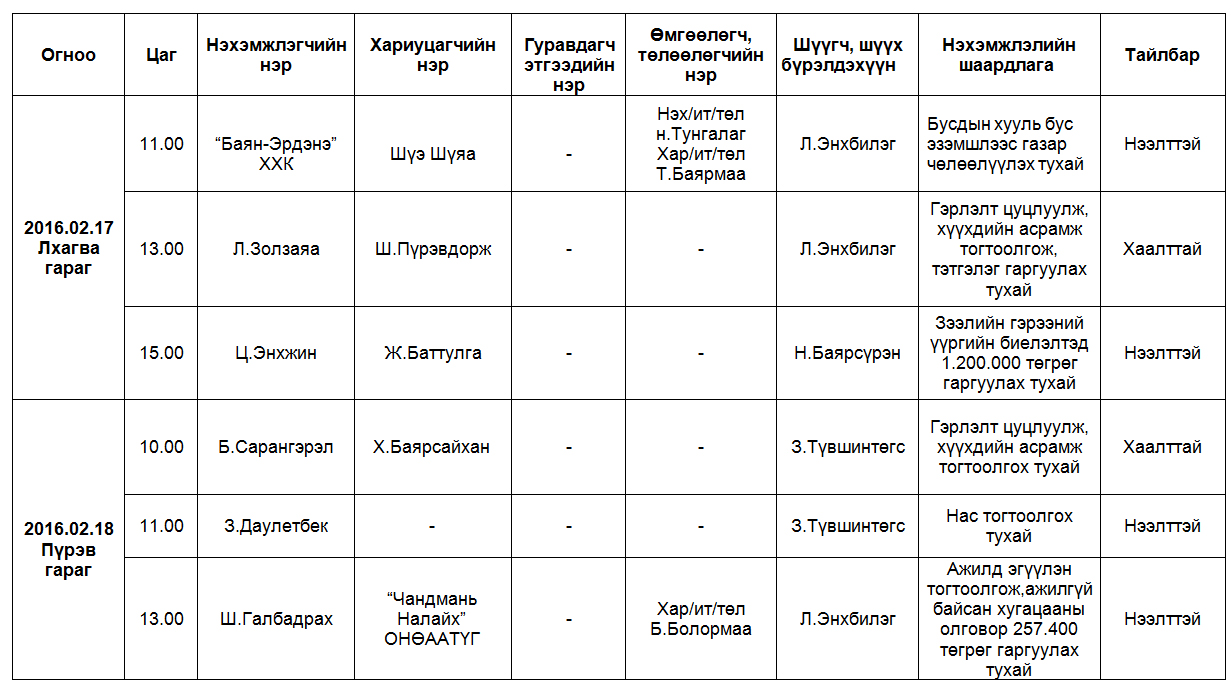 Шүүх хуралдаанаар хэлэлцэх иргэний хэргүүд (2016.02.15-02.19)