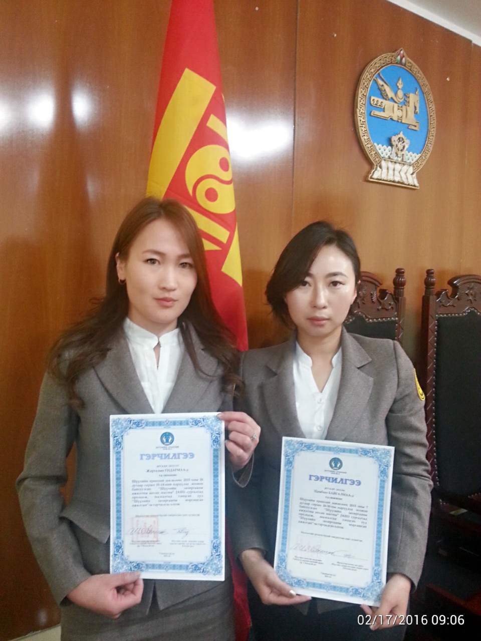 Шүүхийн Ерөнхий Зөвлөлөөс 2015 оны 10 дугаар сарын 05-14-ний өдрүүдэд зохион байгуулсан "Шүүхийн захиргааны ажилтны анхан шатны” JA(01) сургалтад хамрагдаж, шалгалтад тэнцсэн Багахангай, Налайх дүүргийн Эрүүгийн хэргийн анхан шатны шүүхийн шүүгчийн туслах Ц.Байгалмаа, Иргэний хэргийн анхан шатны шүүхийн шүүгчийн туслах Ж.Ундармаа нарт "Шүүхийн захиргааны мэргэшсэн ажилтан”-ы гэрчилгээг шүүхийн хамт олны өмнө хүндэтгэлтэйгээр гардуулан өглөө.