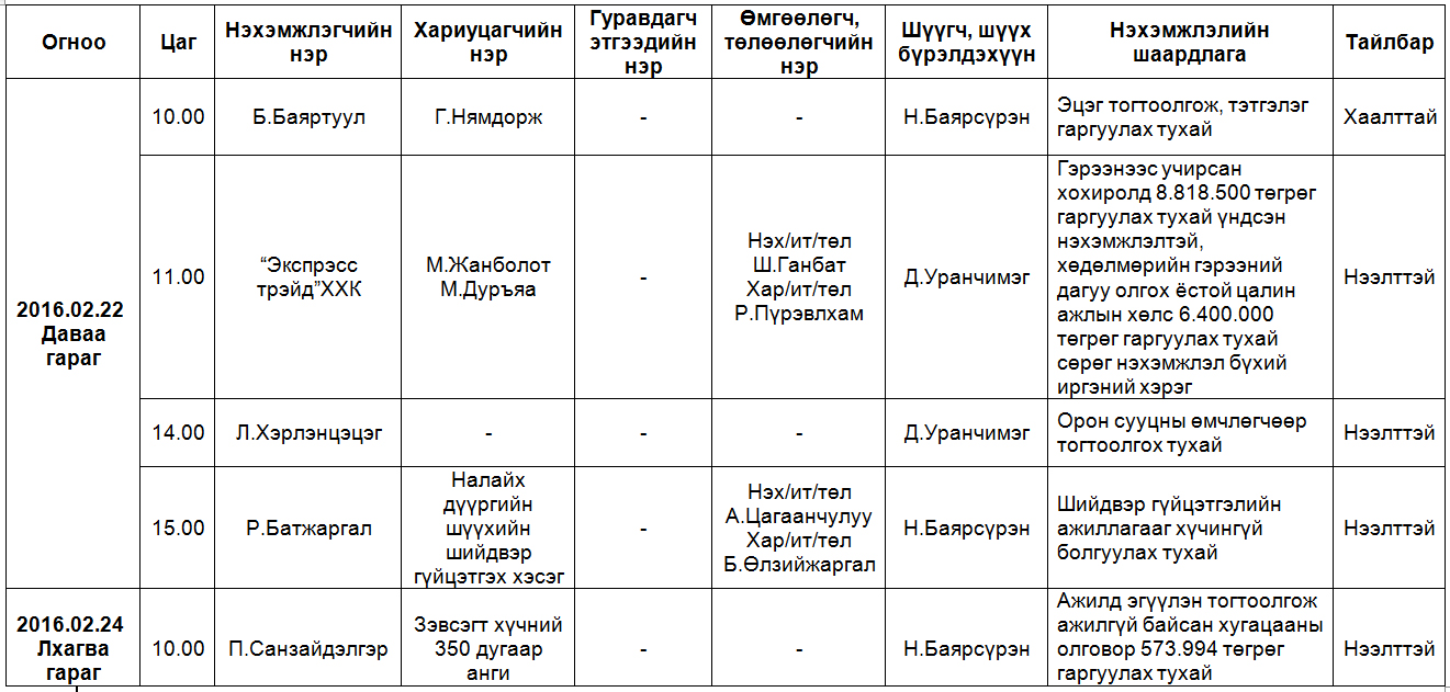 Шүүх хуралдаанаар хэлэлцэх иргэний хэргүүд (2016.02.22-02.26)