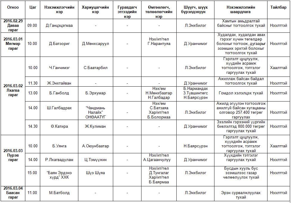 Шүүх хуралдаанаар хэлэлцэх иргэний хэргүүд (2016.02.29-03.04)