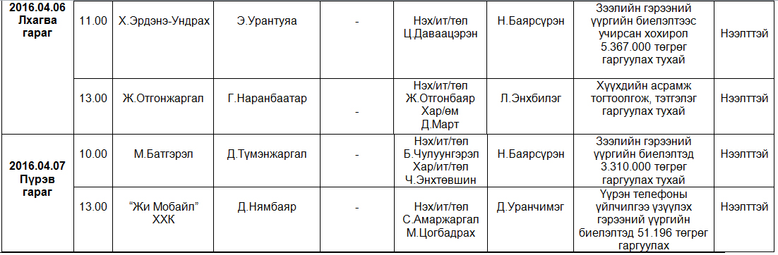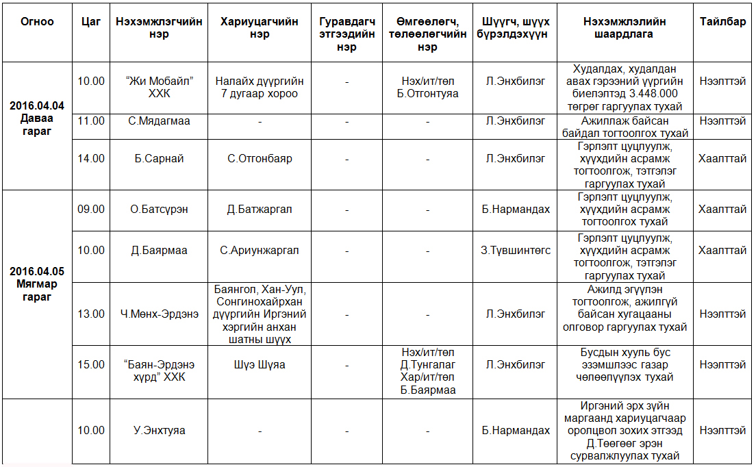 Шүүх хуралдаанаар хэлэлцэх иргэний хэргүүд (2016.04.04-04.08)