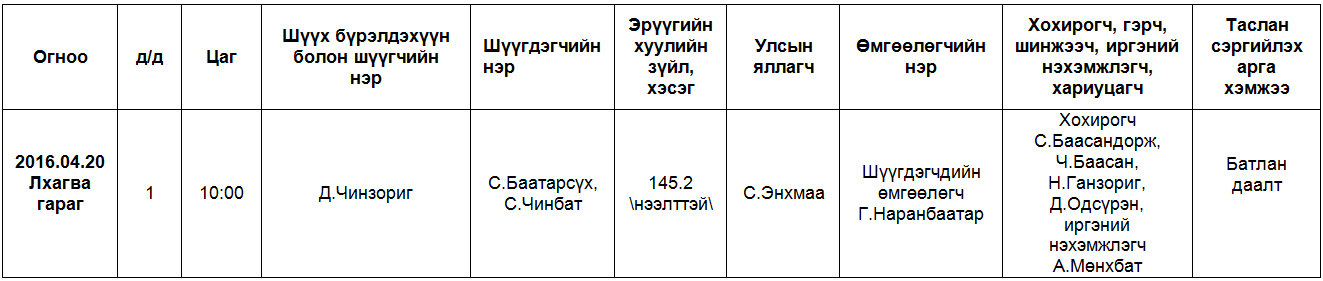 АНХАН ШАТНЫ ШҮҮХ ХУРАЛДААНААР ХЭЛЭЛЦҮҮЛЭХ ЭРҮҮГИЙН ХЭРГҮҮД (2016.04.18-04.22)