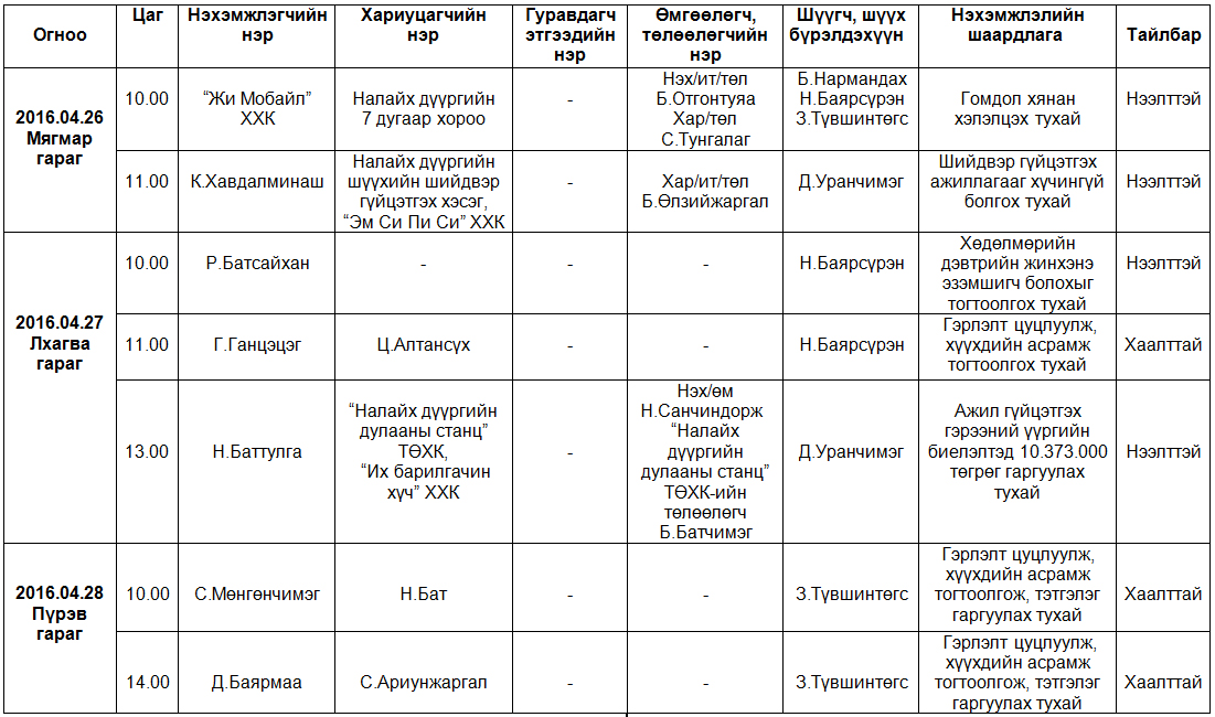 Шүүх хуралдаанаар хэлэлцэх иргэний хэргүүд (2016.04.25-04.29)