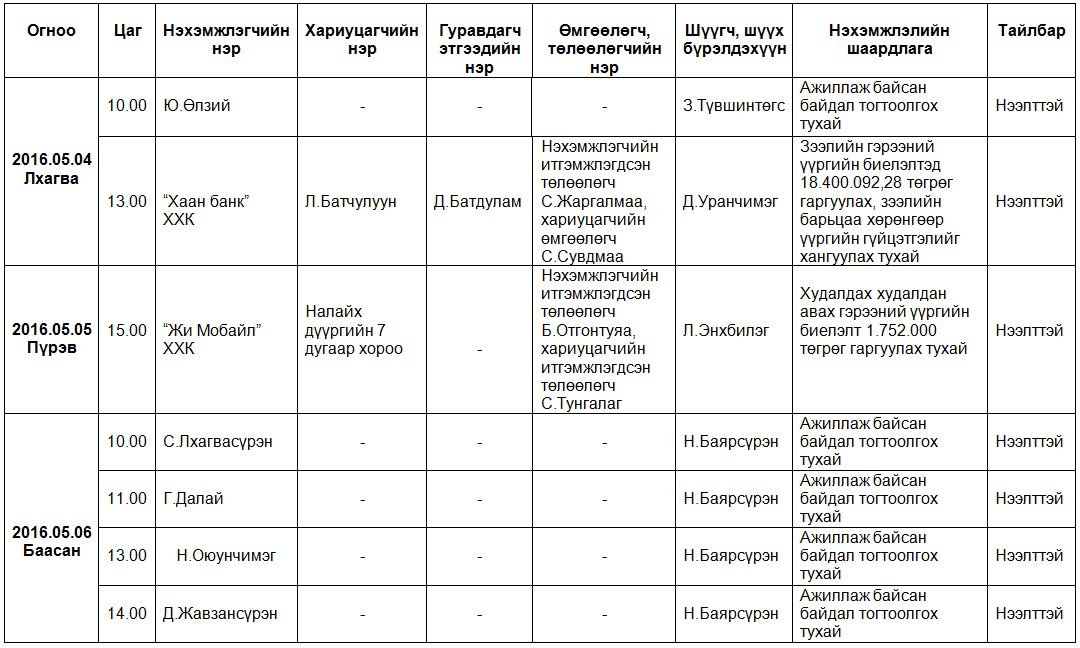 Шүүх хуралдаанаар хэлэлцэх иргэний хэргүүд (2016.05.02-05.06)