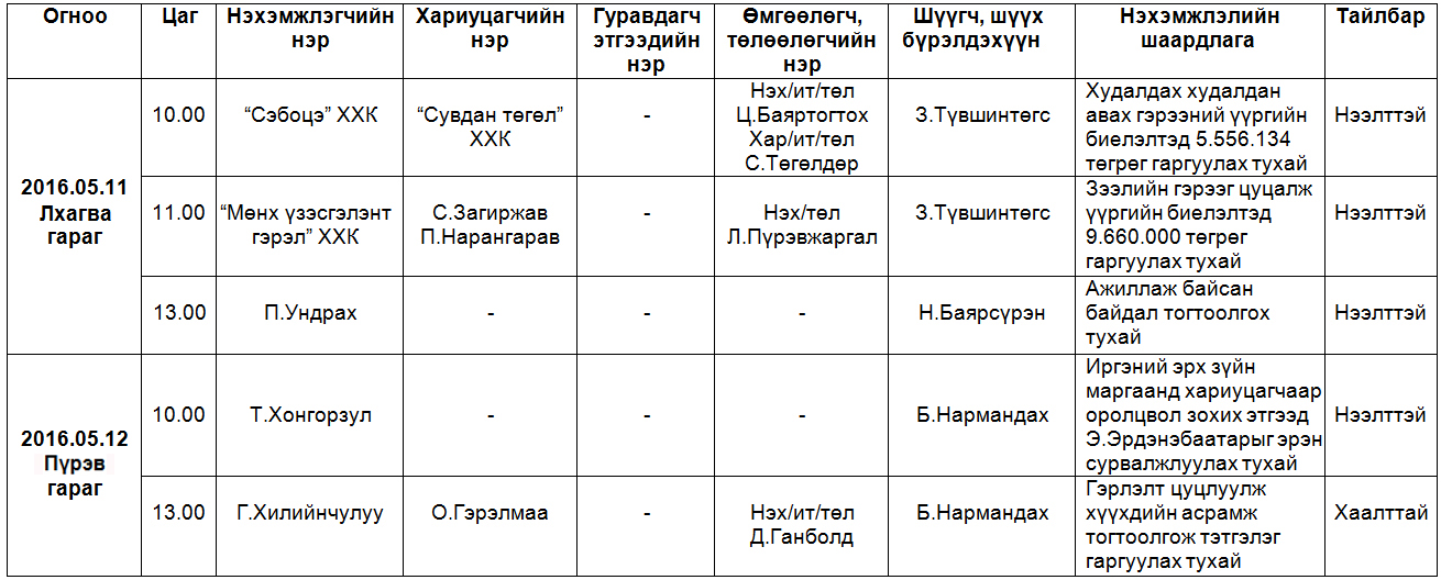 Шүүх хуралдаанаар хэлэлцэх иргэний хэргүүд (2016.05.09-05.13)