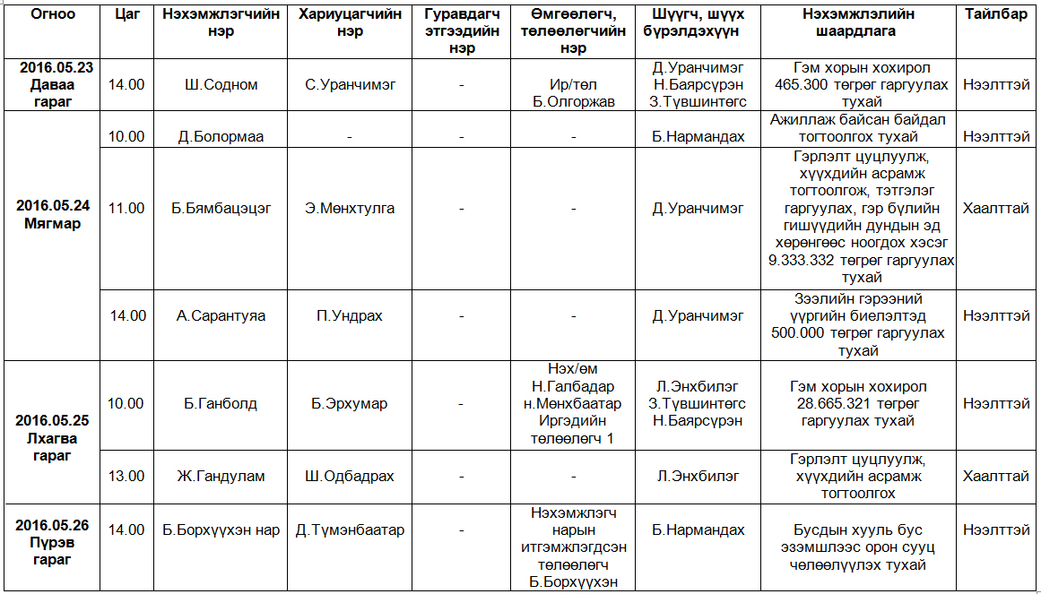 Шүүх хуралдаанаар хэлэлцэх иргэний хэргүүд (2016.05.23-05.27)