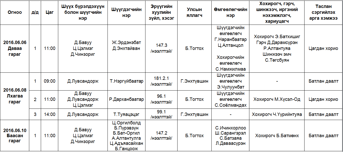 АНХАН ШАТНЫ ШҮҮХ ХУРАЛДААНААР ХЭЛЭЛЦҮҮЛЭХ ЭРҮҮГИЙН ХЭРГҮҮД (2016.06.06-06.10)