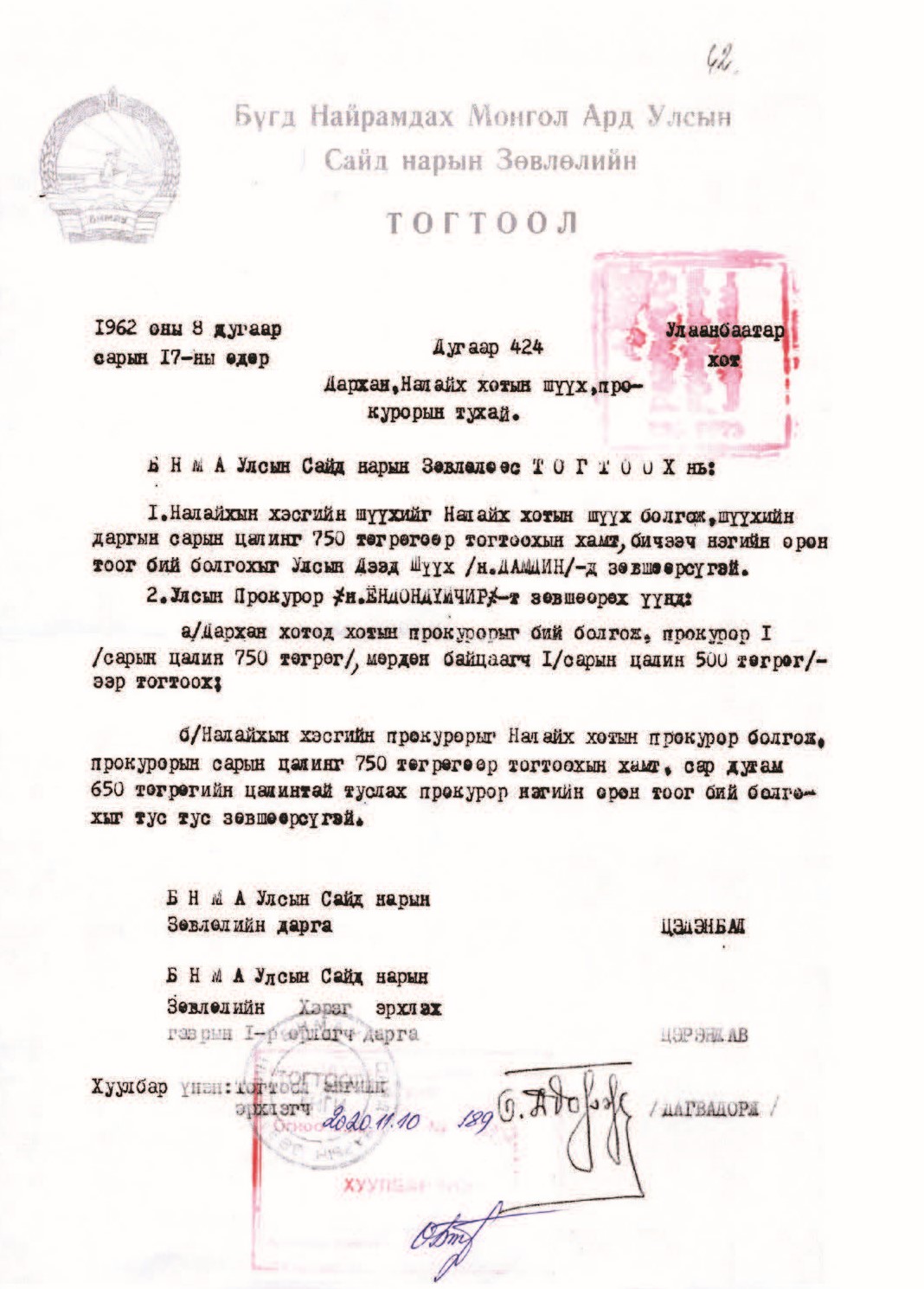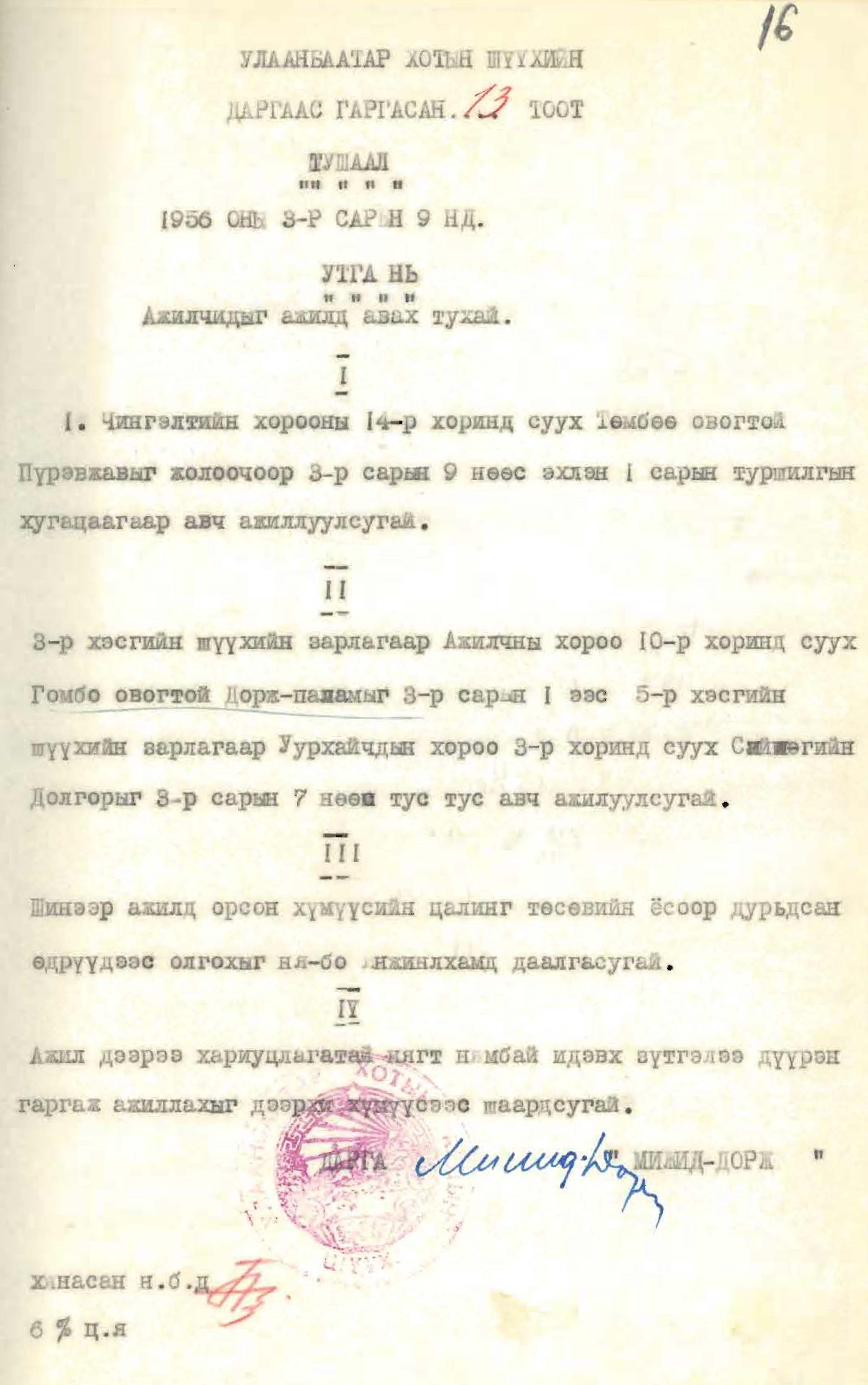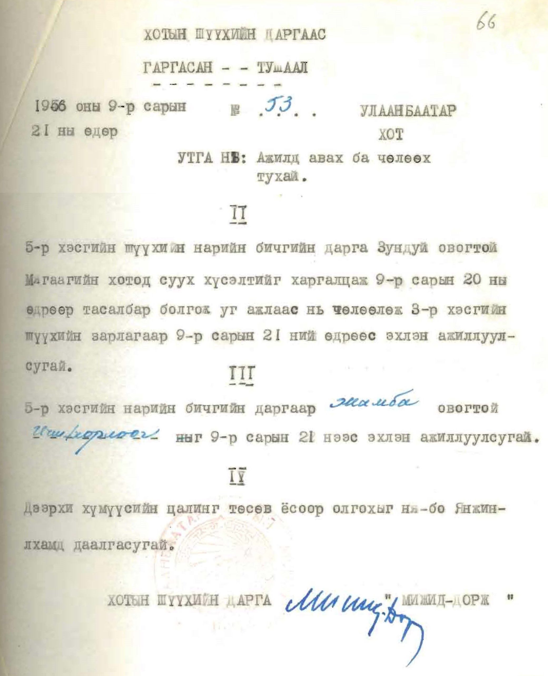 1956 оны 3 дугаар сарын 01-ний өдөр Улаанбаатар хотод ардын хэсгийн 5 шүүх байгуулагдахаас өмнө Уурхайчдын хороо буюу Налайхад шүүн таслах ажиллагааг Улаанбаатар хотын шүүхээс шүүгч томилогдон ирж, нүүдэллэн ажиллаж байсан болох нь дараах баримтуудаас харагдаж байна.